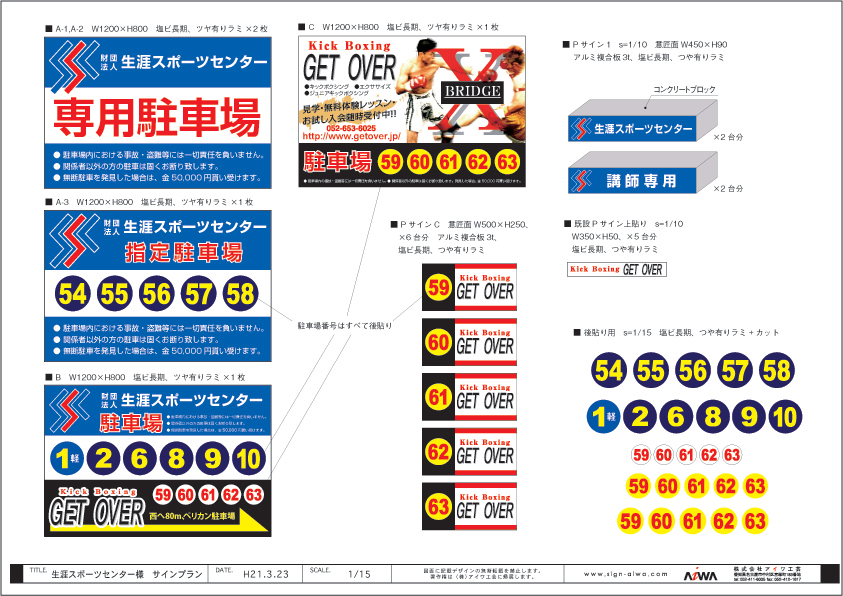名古屋市熱田区にある財団法人生涯スポーツセンター様と同ビル6階のキックボクシングジムGetOver様の駐車場サイン設置を行いました。これまで間違った駐車スペースに停めたり近所の飲食店来客が駐車したりとトラブルが多かったので駐車スペースを一目で分かるようにしました。生涯スポーツセンターでは幅広いプログラムをご用意しております。メタボ対策に一汗流しては如何でしょうか?