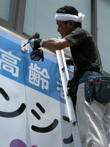 アームスポットの台座をビス固定しているところです。24時間スタッフの出入りがあるということなのでスポットの光が防犯用としても一役かってくれます
